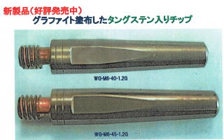 (例えば、ダイヘンのシンクロフィード型溶接機など)に用いると、チップ寿命が大きく完全されるように、ワイヤ接触部にタングステンを入れたチップである。 よって、数10時間の溶接作業を中断することなく、継続できる。